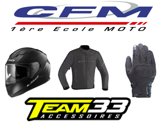 Pour passer le permis, vous rééquiper, ou équiper votre moitié ou vos enfants, prenez le temps de passez chez Team33 et découvrir le kit équipements Centre de Formation Moto (CFM33) chez Team33.